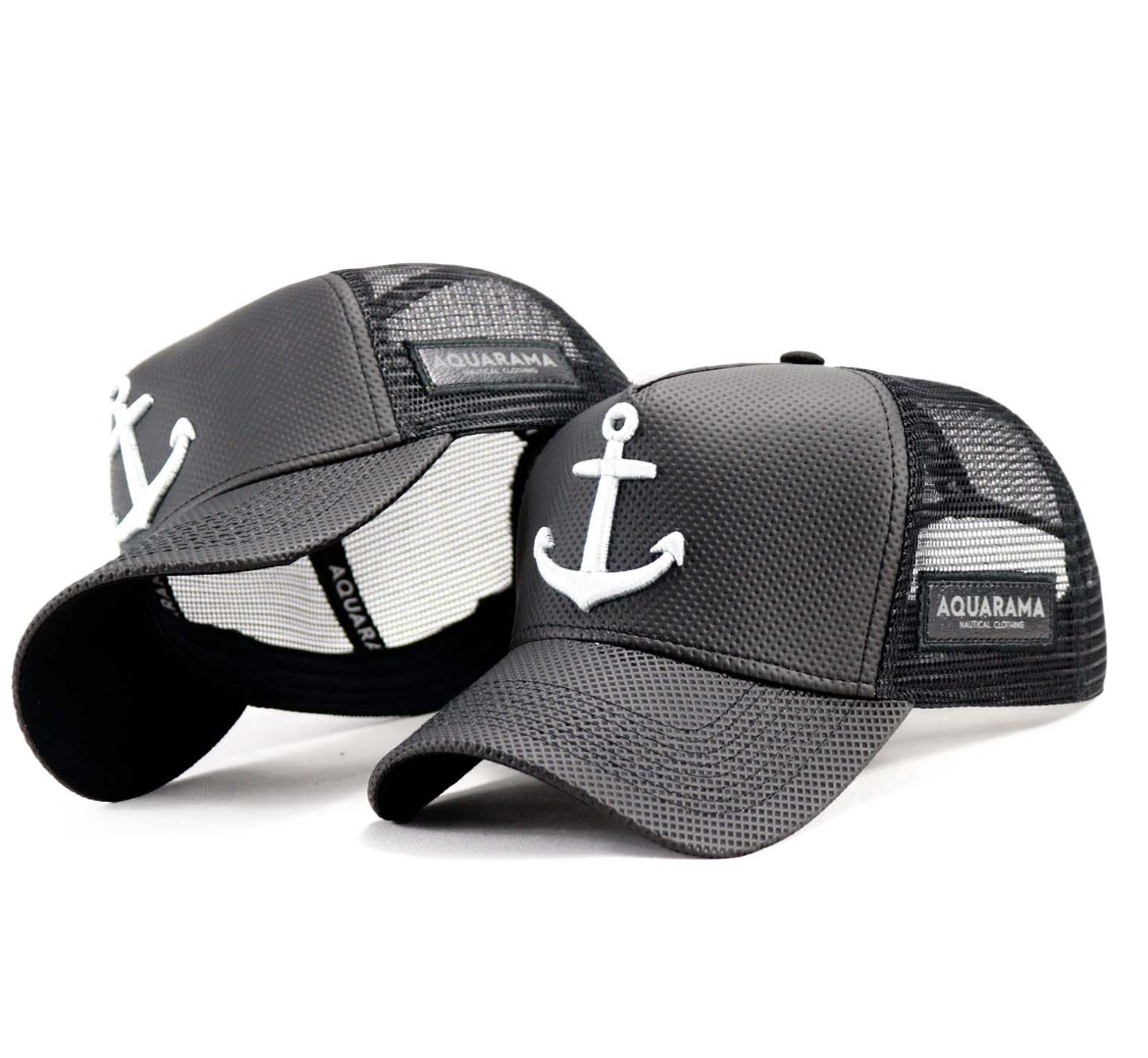 Boné Âncora Silver - Modelo Trucker feito em tecido de 100% poliéster, frente e aba em couro sintético automotivo e logo prateado em bordado evelo utilizando E.V.A, onde tem a função de dar volume, sendo referência para agregar mais visibilidade e boa aparência ao bordado e fazem com que a percepção do 3D ganhe mais relevância. Tem a aba curva, presilha plástica reguladora atrás e a tela na parte traseira, que permite a ventilação do couro cabeludo.