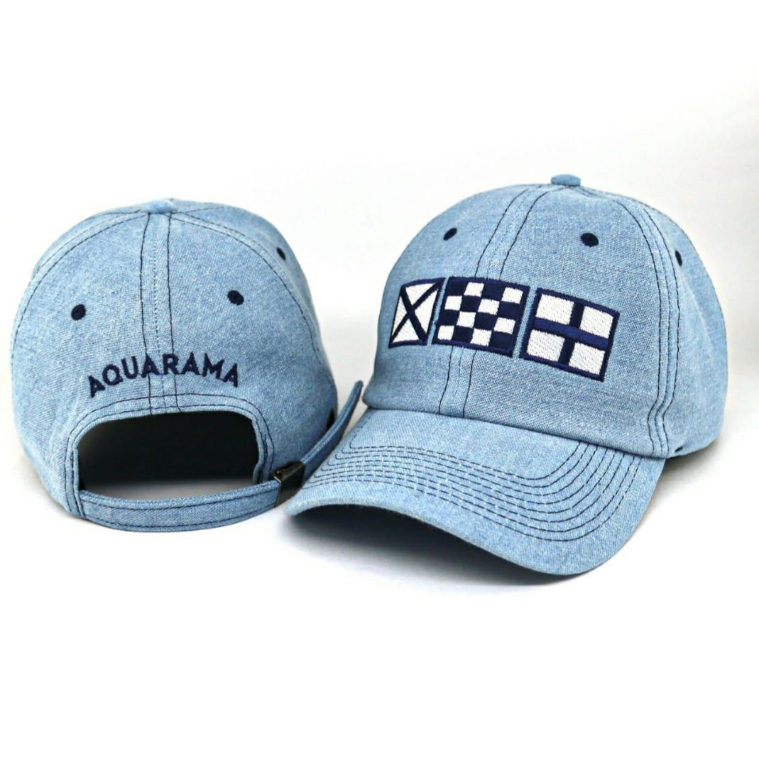 Boné Bandeiras Náuticas - Modelo Daddycap com bordado frontal, feito em tecido de jeans lavado de alta qualidade. Tem a aba curva, arreata reguladora com esconderijo e com o bordado da marca Aquarama na parte traseira.
